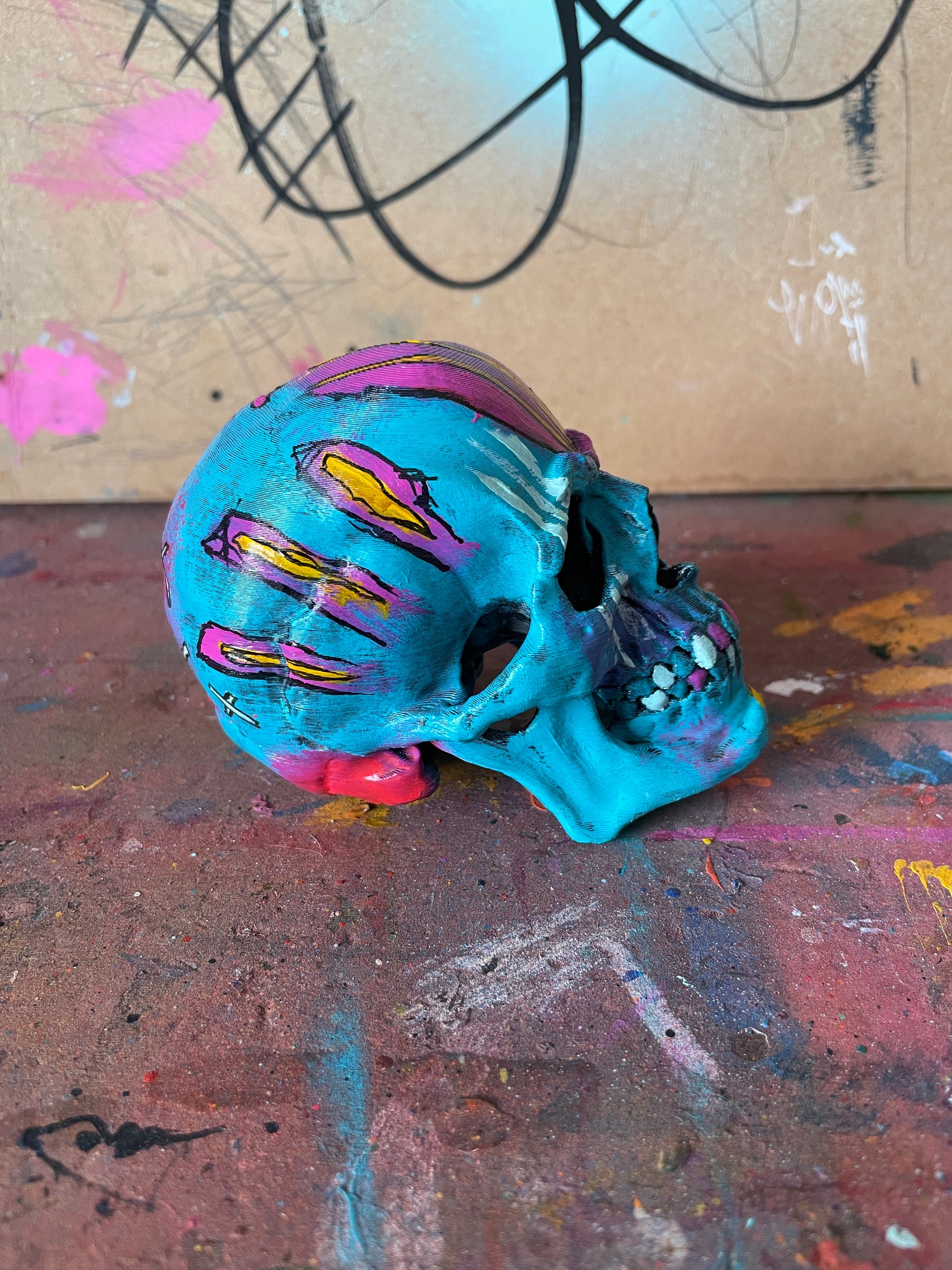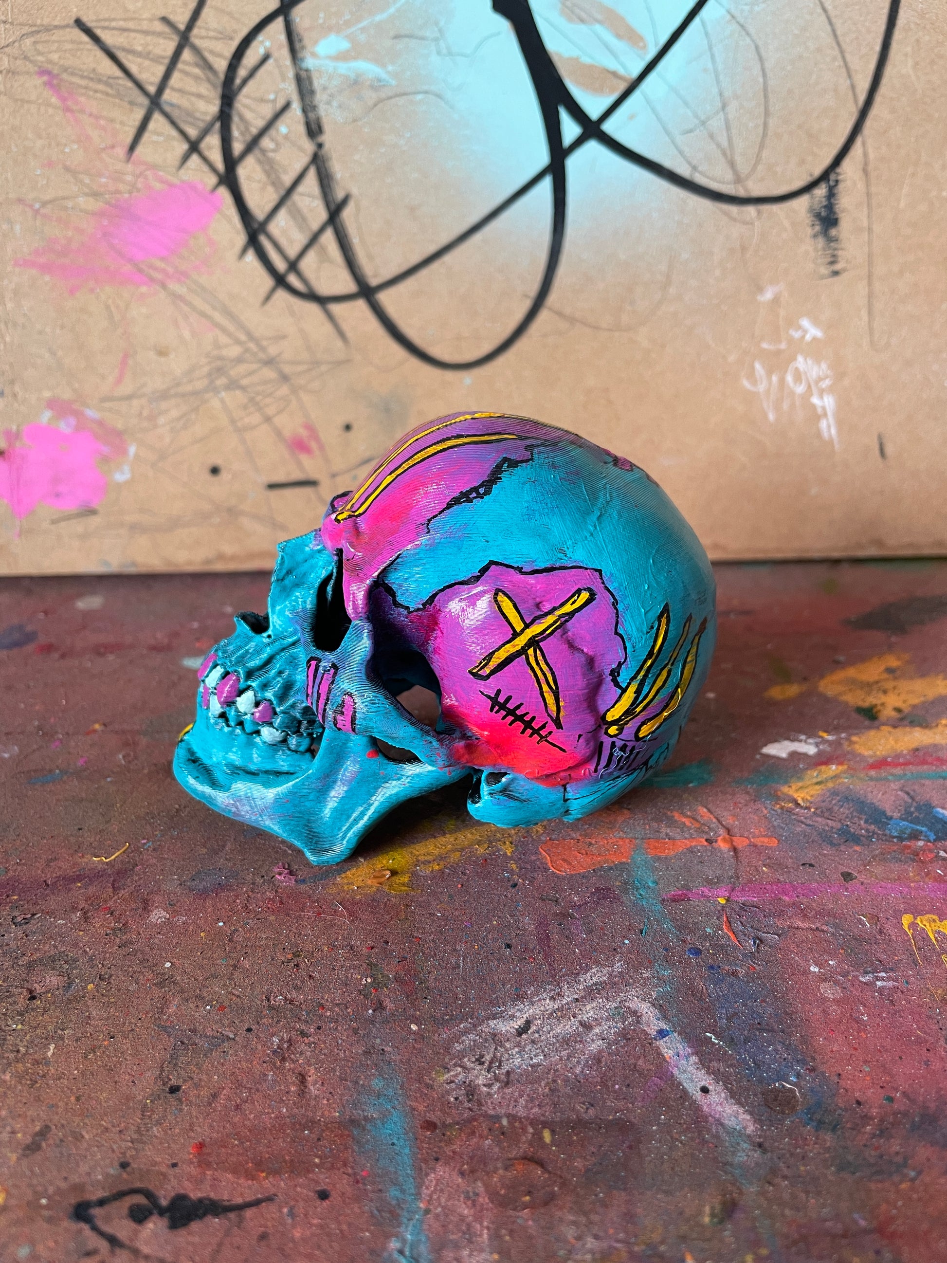 3D printed plastic skull hand painted with acrylics, spray paint and markers.