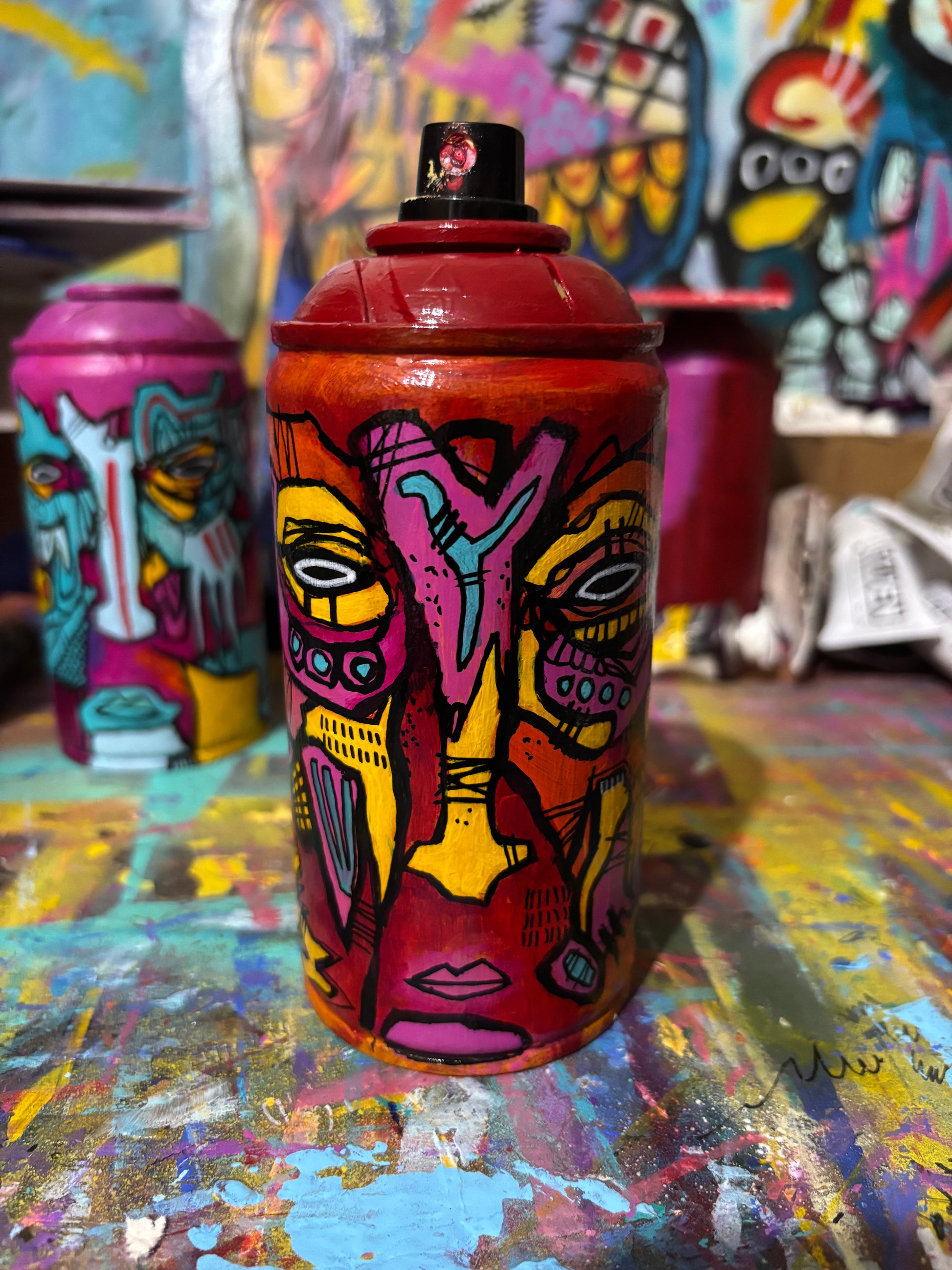 This one-of-a-kind painted spray can is painted to reduce waste materials and is overflowing with personality. Enjoy some street art magic with its vivid acrylic colours and distinct faces on the can.
